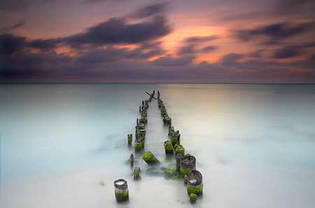 the Sea looks icy blue. The old pier draws the eye perfectly into the